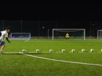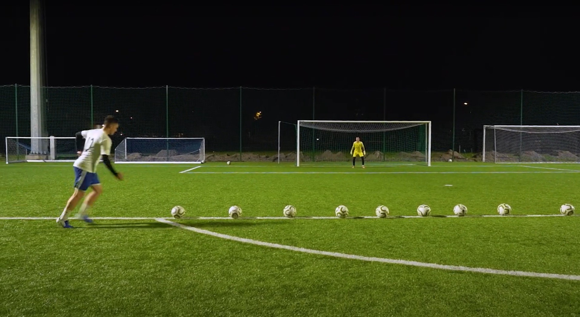 Wykonaj 10 strzałów na bramkę ze stojącej piłki w odległości 14 m. Masz 10 strzałów, liczy się celność.