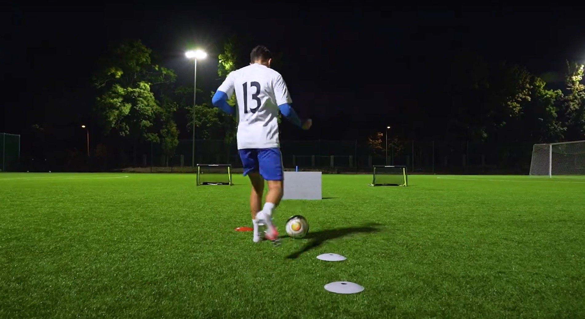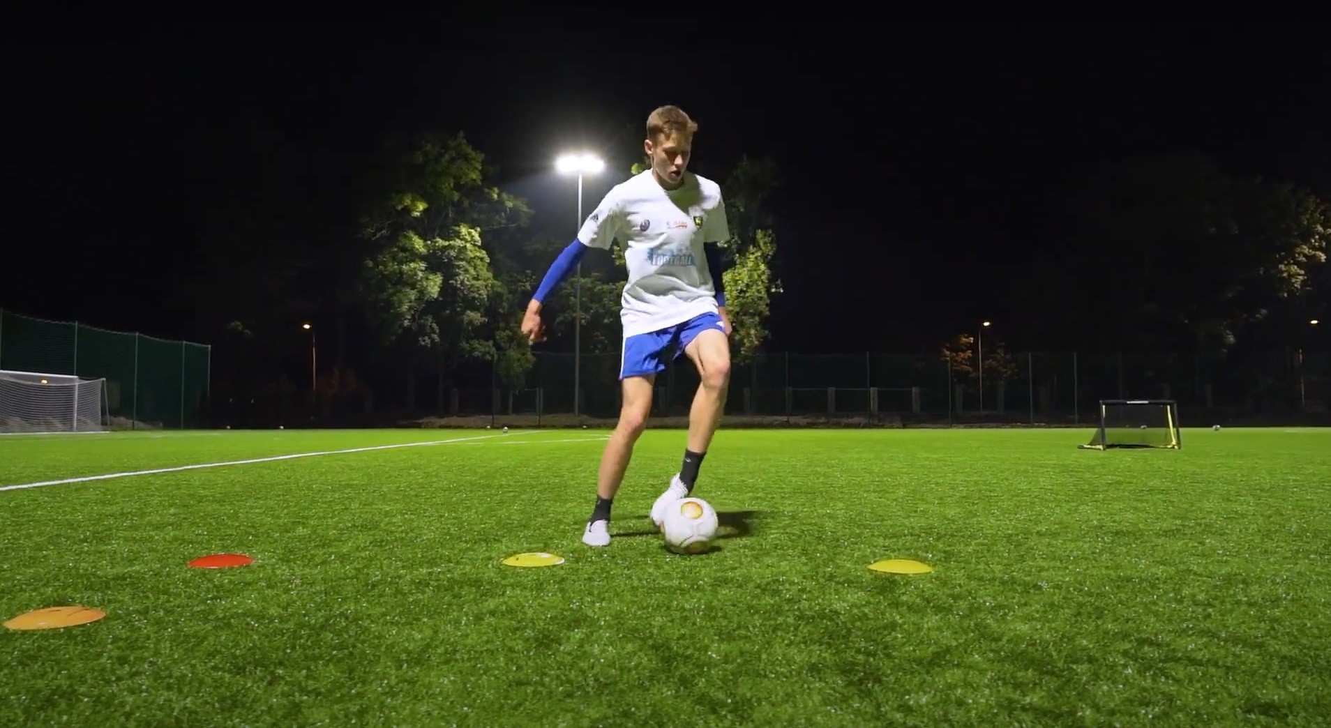 Prowadź piłkę i wykonaj zwód nad piłką przenosząc ciężar ciała na drugą stronę. Wykonaj jak najwięcej powtórzeń w czasie 60 sekund