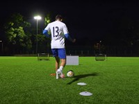Po wykonaniu ćwiczenia techniki fundamentalnej na stożkach oddaj strzał do jednej z dwóch małych bramek. Liczy się celność oraz ilość zdobytych bramek.