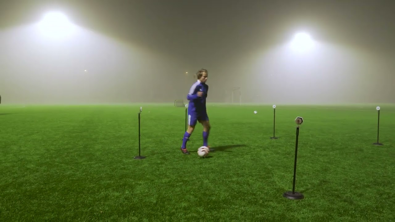Zawodnik ustawiony pośrodku stożków ustawionych w linii. Ćwiczący ma za zadanie wykonać ćwiczenie techniki fundamentalnej oraz prowadząc piłkę "zgasić" czujnik, który podświetli się w danym momencie za pomocą ruchu nad nim nogą. Czas pracy 60 sekund. Liczy się jak największa ilość celnych "zgaszonych" czujników w czasie 60 sekund oraz dokładność prowadzenia piłki.