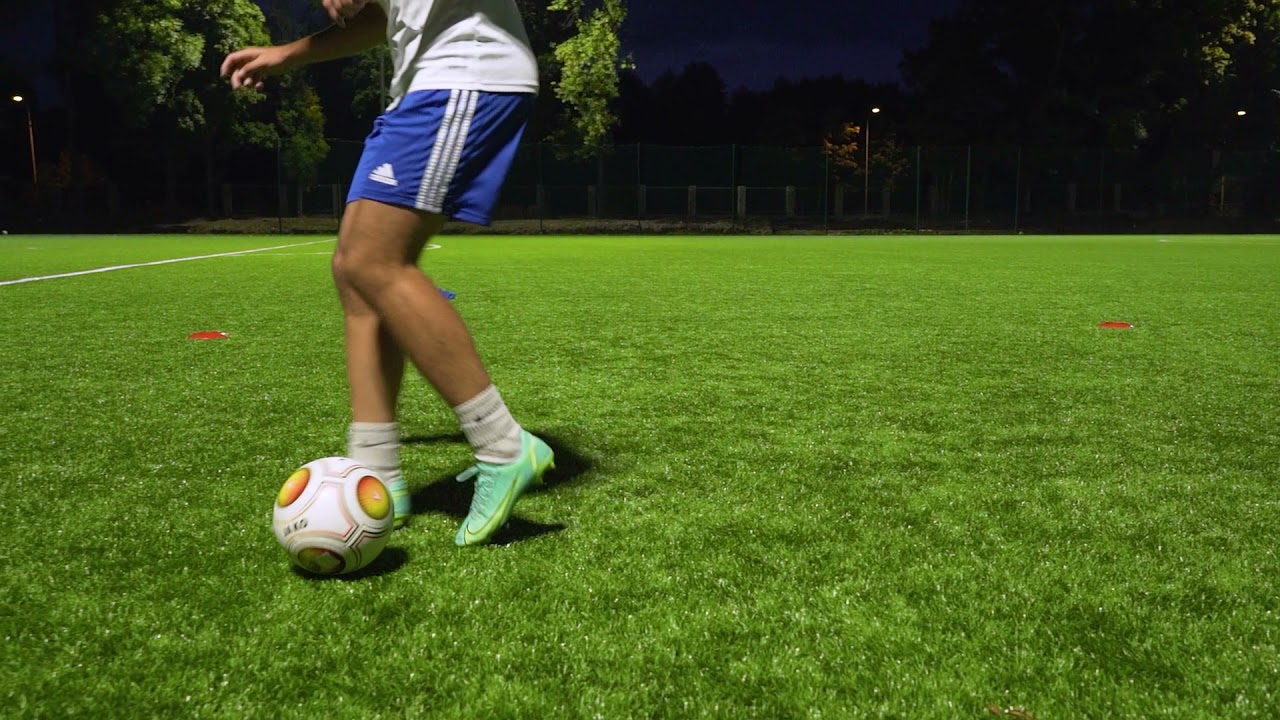 Prowadząc piłkę wykonaj zamach nad piłką do zewnątrz naprzemiennie raz jedną raz drugą nogą. Wykonaj jak największą ilość powtórzeń w czasie 30 sekund.