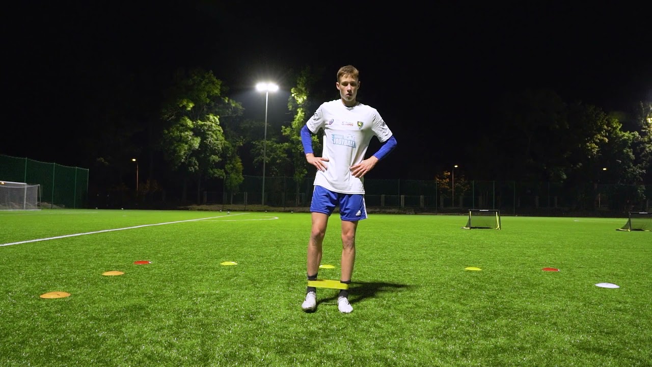 Prowadź piłkę wzdłuż kwadratu lewą nogą w układzie: proste podbicie, wycofanie piłki podeszwą, zewnętrzna część stopy do prawej nogi. Wykonaj jak największą ilość powtórzeń w czasie 30 sekund.